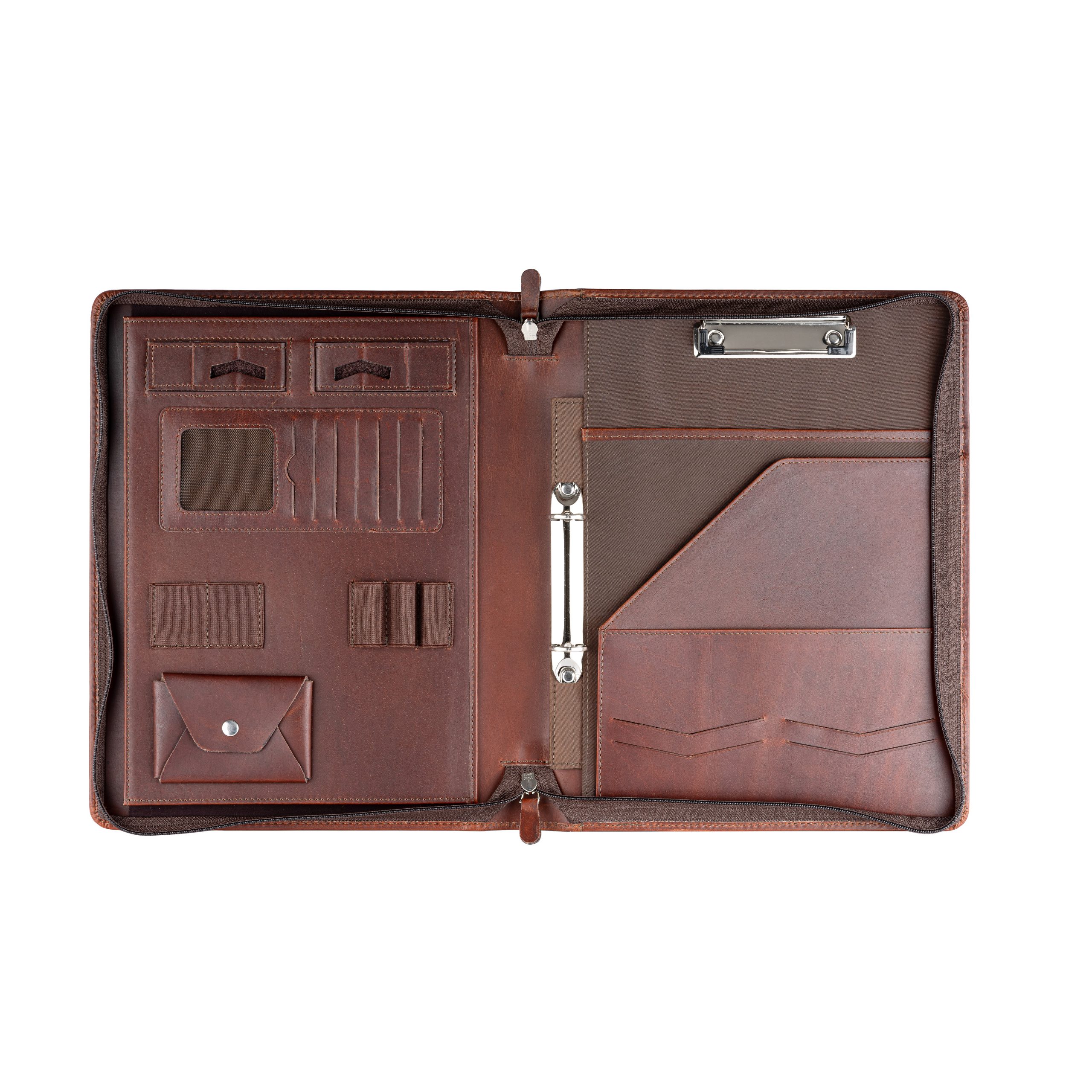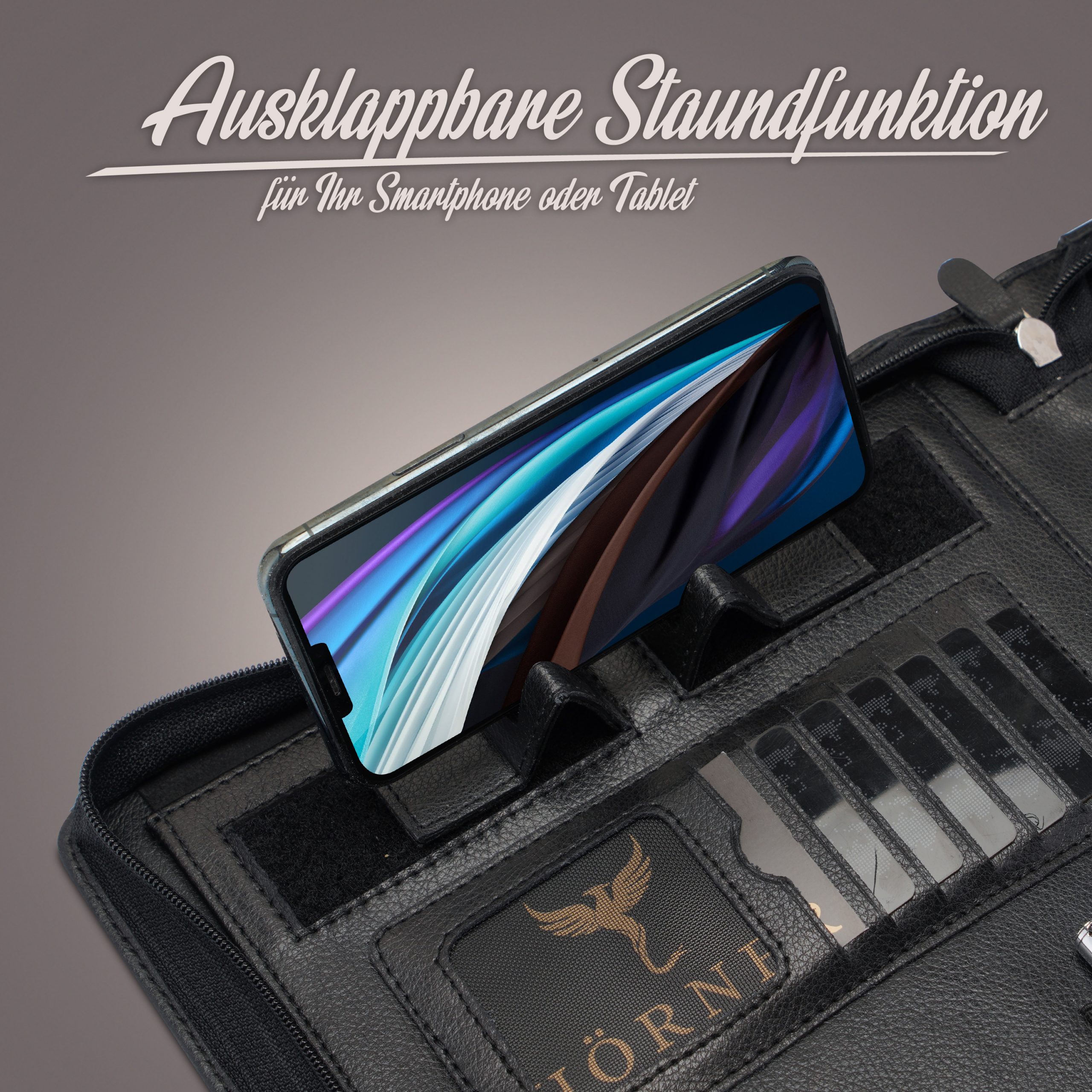 - Innenaufteilung mit Fächern für Stifte, Notizbuch, Smartphone und Dokumente