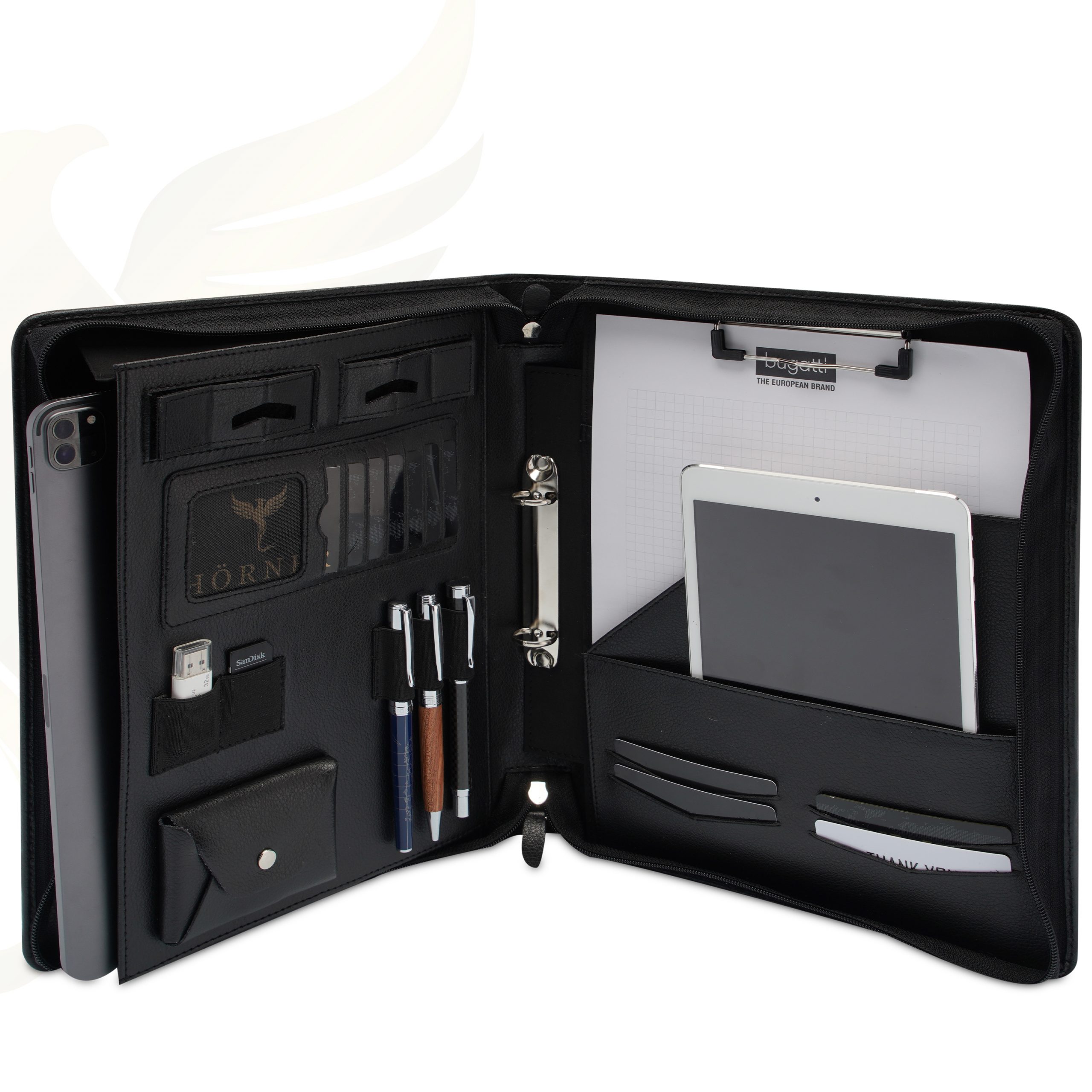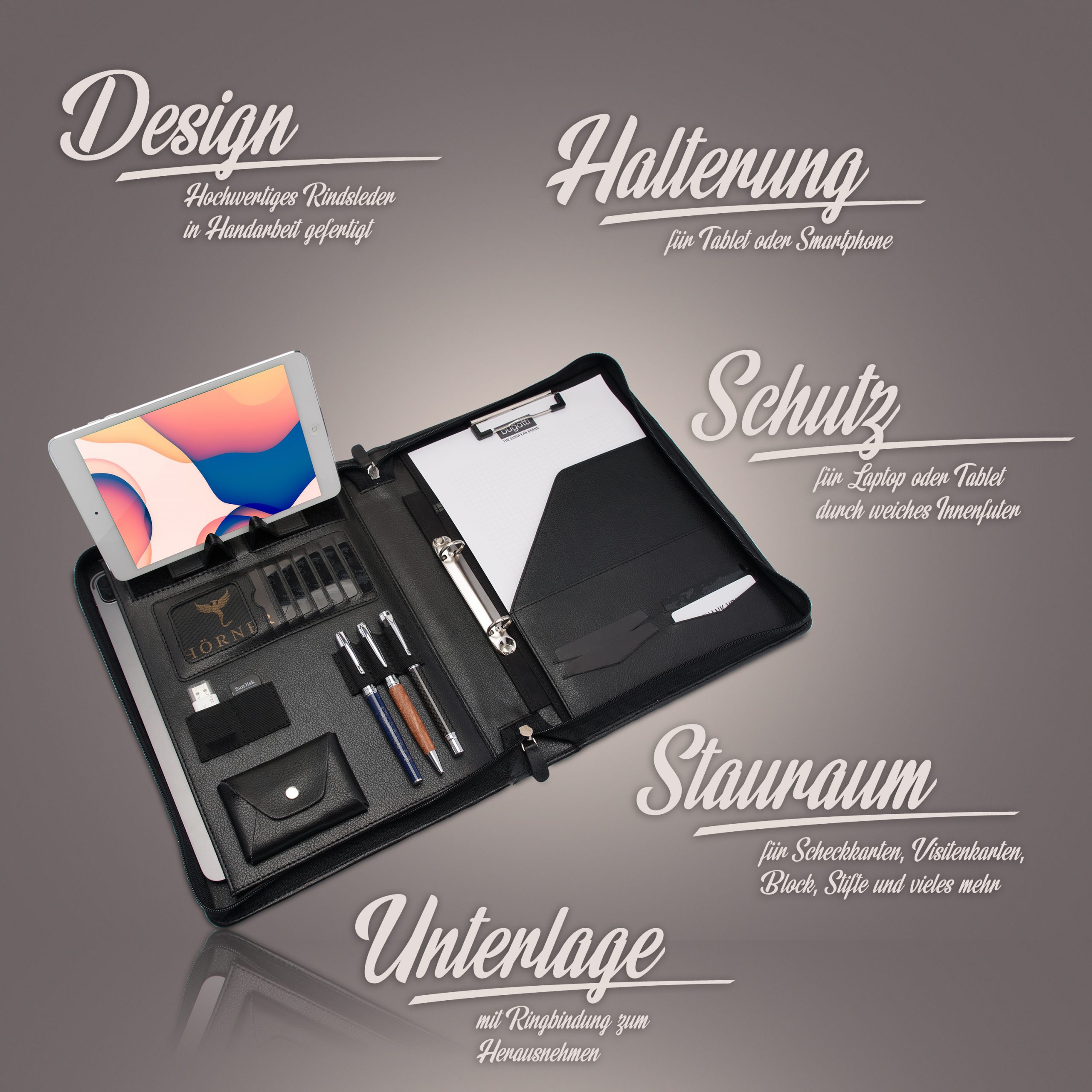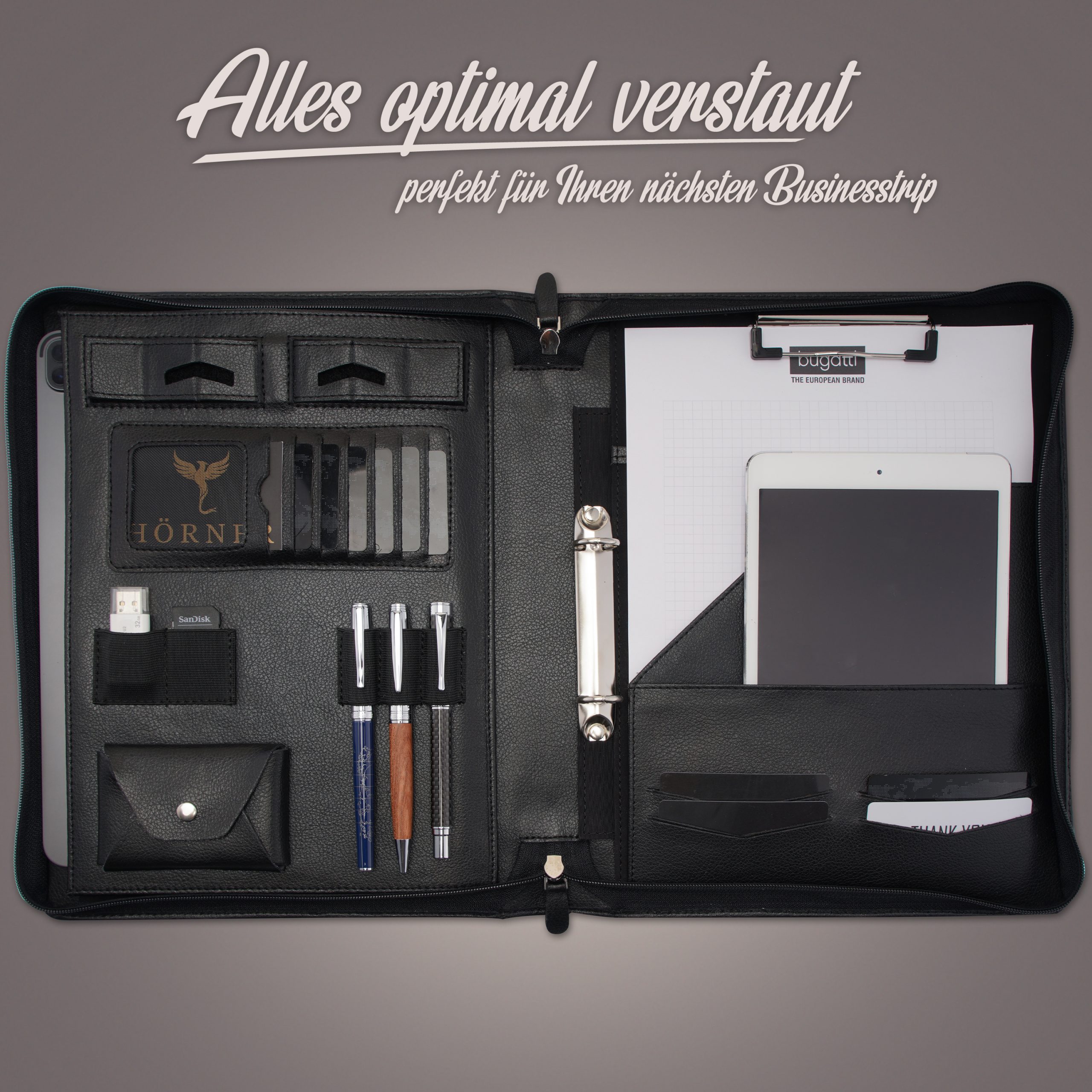 - Innenleben: Visitenkartenfächer, Dokumententaschen, optionale Tablet-Slots